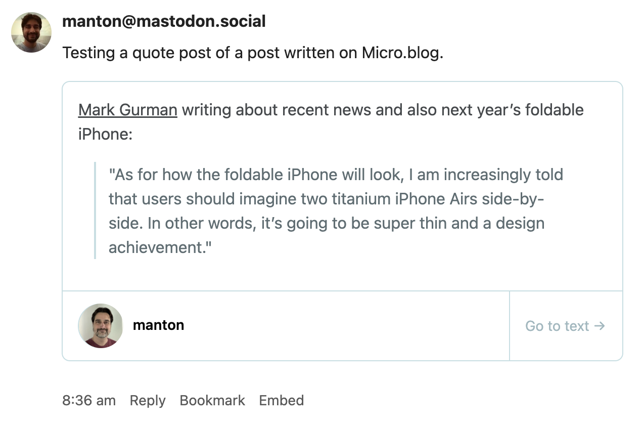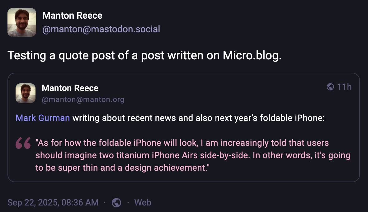 - Micro.blog will display quoted posts from Mastodon, converting them to blog-like