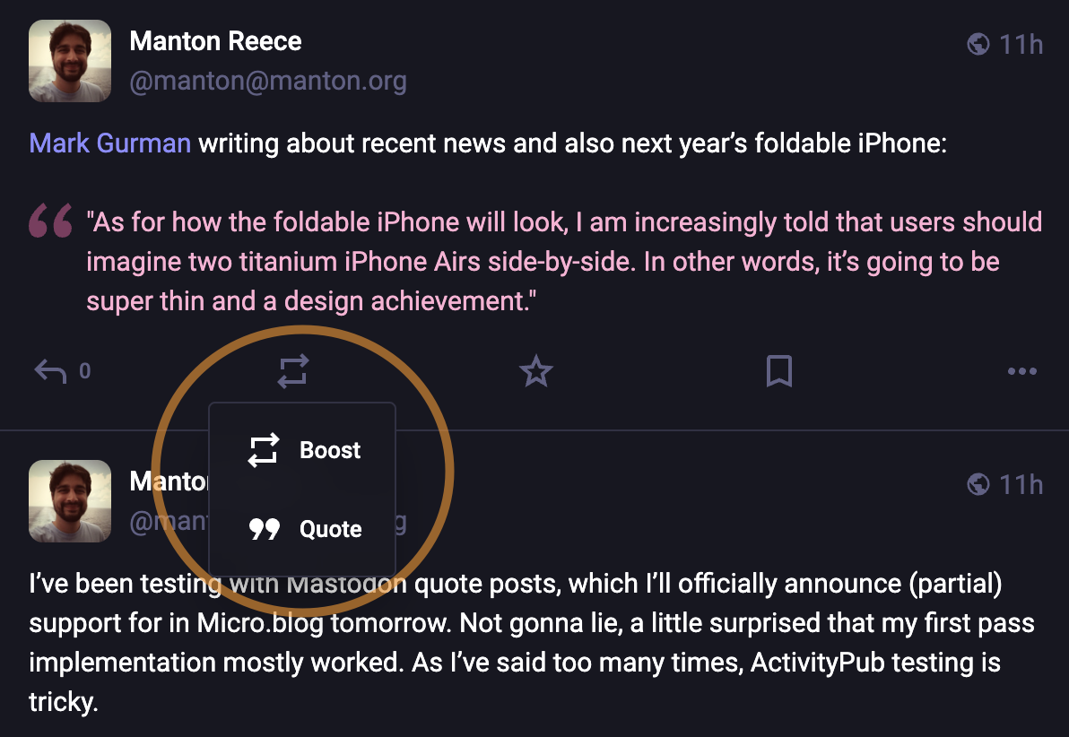Mastodon 4.5 adds special support for quote posts and quoting permissions. In Micro.blog, we support these in a few ways: