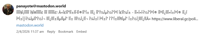 Text in Greek from the fediverse appears as gibberish. Here’s an example: