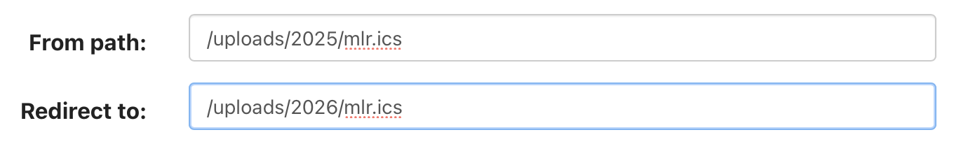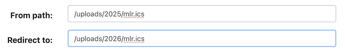 I deleted all files *.ics. I can’t specifically delete /uploads/2025/mlr.ics because the UI doesn’t have folders. And yes, thats exactly what the redirect looks like.