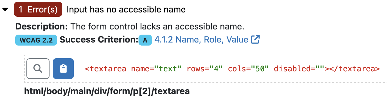 It looks like the label element fell off somehow. In your screenshot, the path ends with /form/p[2]/textarea but it should be /form/p[2]/label/textarea.